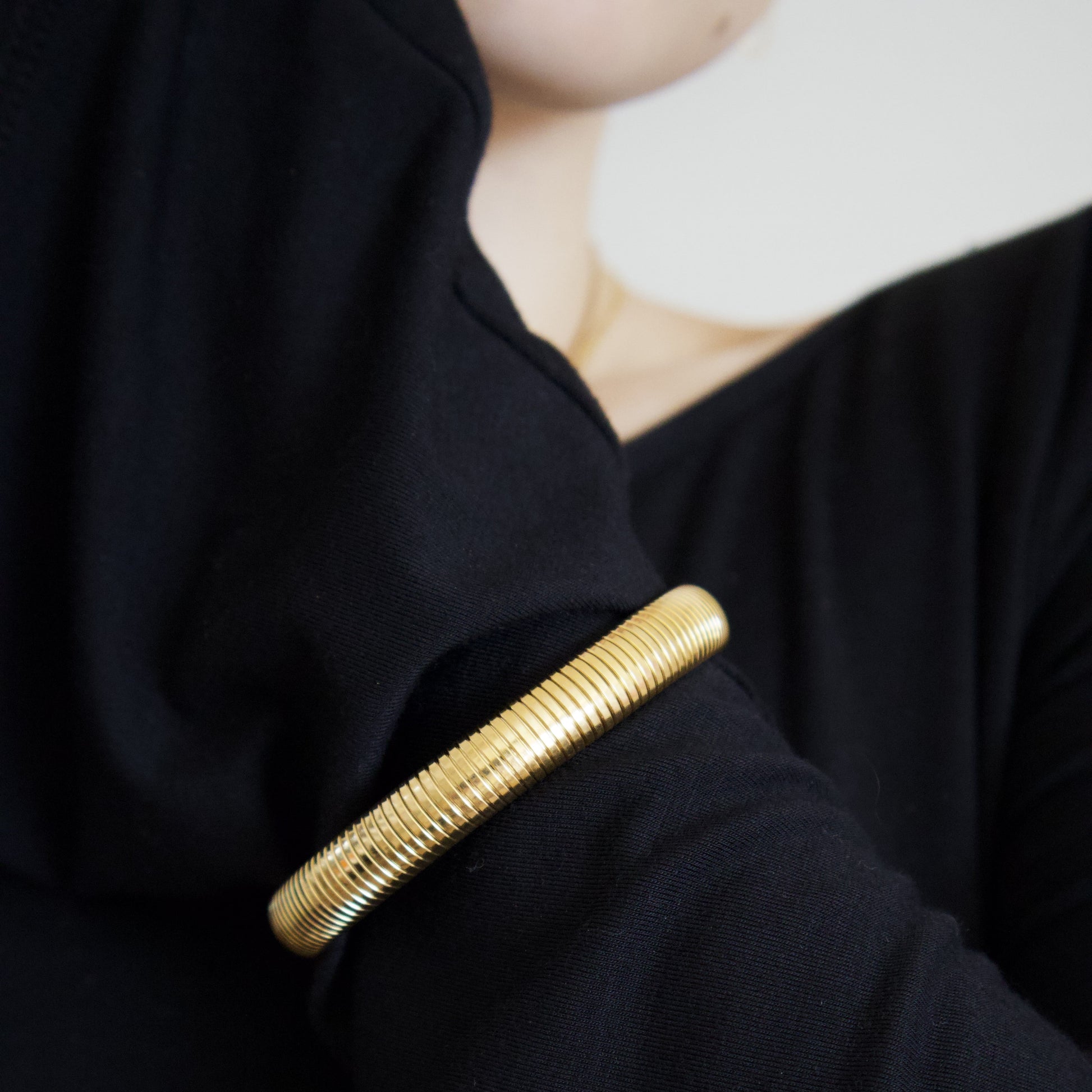 Introducing our 18k Gold Plated Elasticated stacking bangles, where durability meets sleek elegance. Crafted from stainless steel and designed to be waterproof, these bangles make a true statement. Enjoy timeless style with the ease of maintenance.