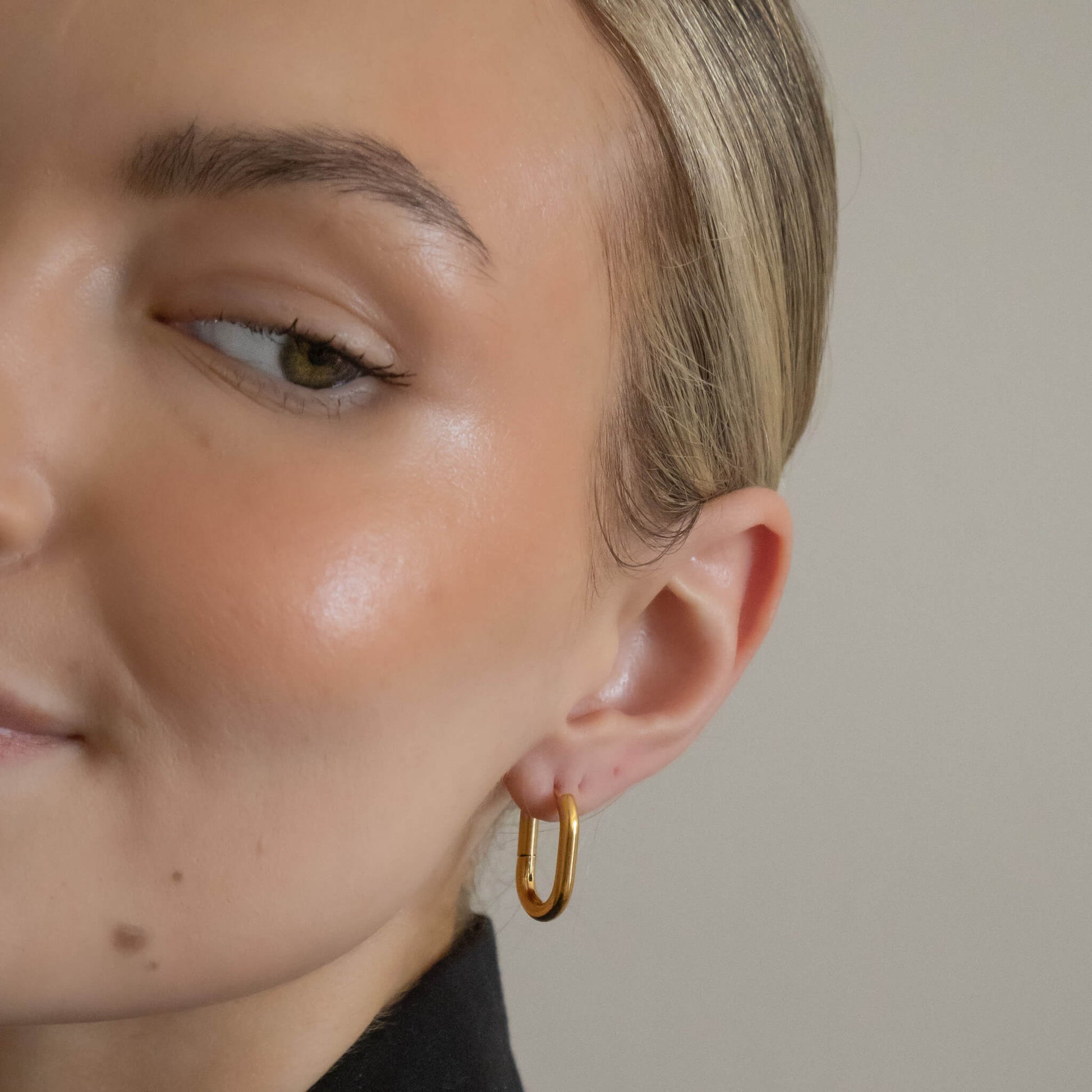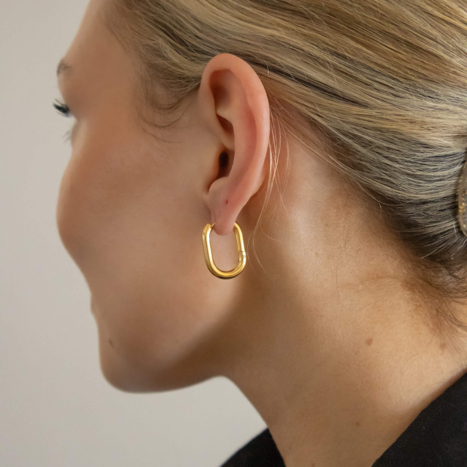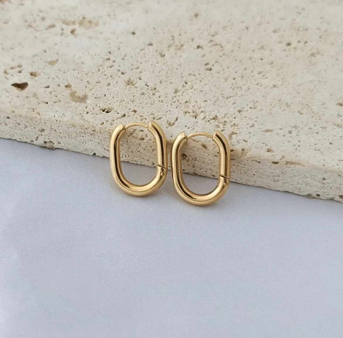 Enhance your elegance with our 18k Gold Plated Waterproof Oval Hoop Huggie Earrings. Designed for durability and versatility, they effortlessly transition from beach days to evenings out. Enjoy lasting brilliance with easy maintenance. Elevate your style with practical luxury.