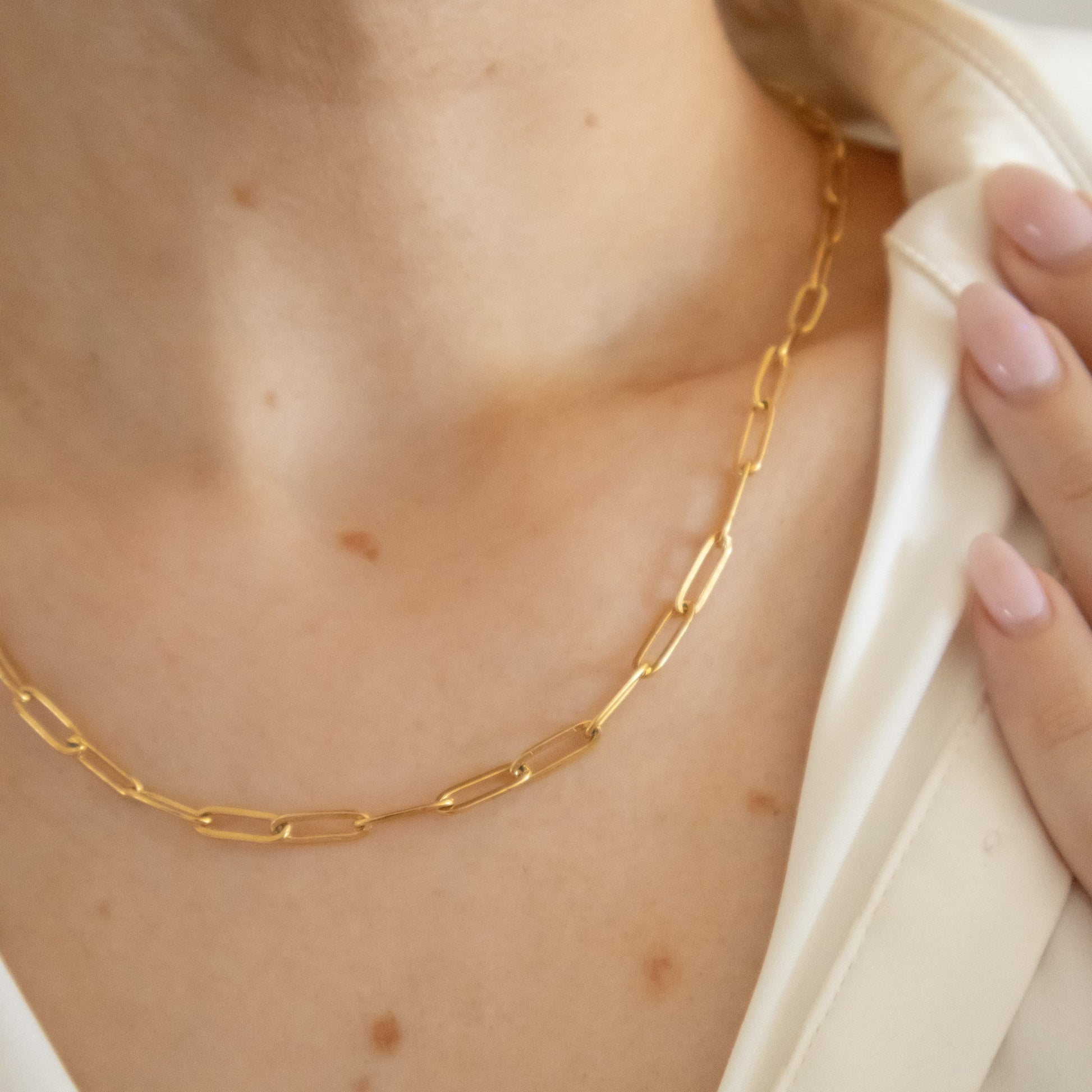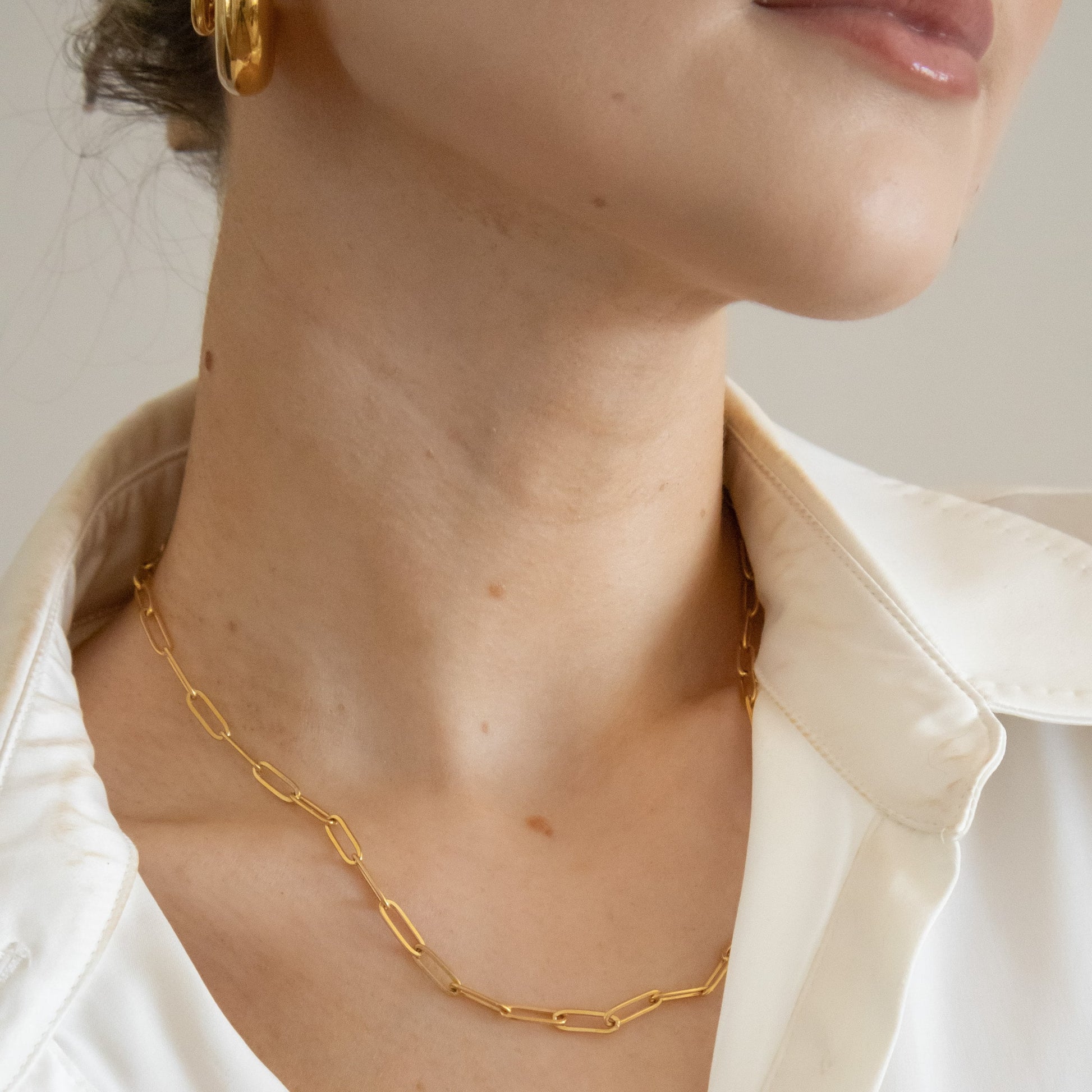 Golden links, timeless feel. The Paper Clip Necklace is plated in 18k gold and designed to handle everyday life with grace. It transitions effortlessly from casual layers to evening statements, And it won’t tarnish.