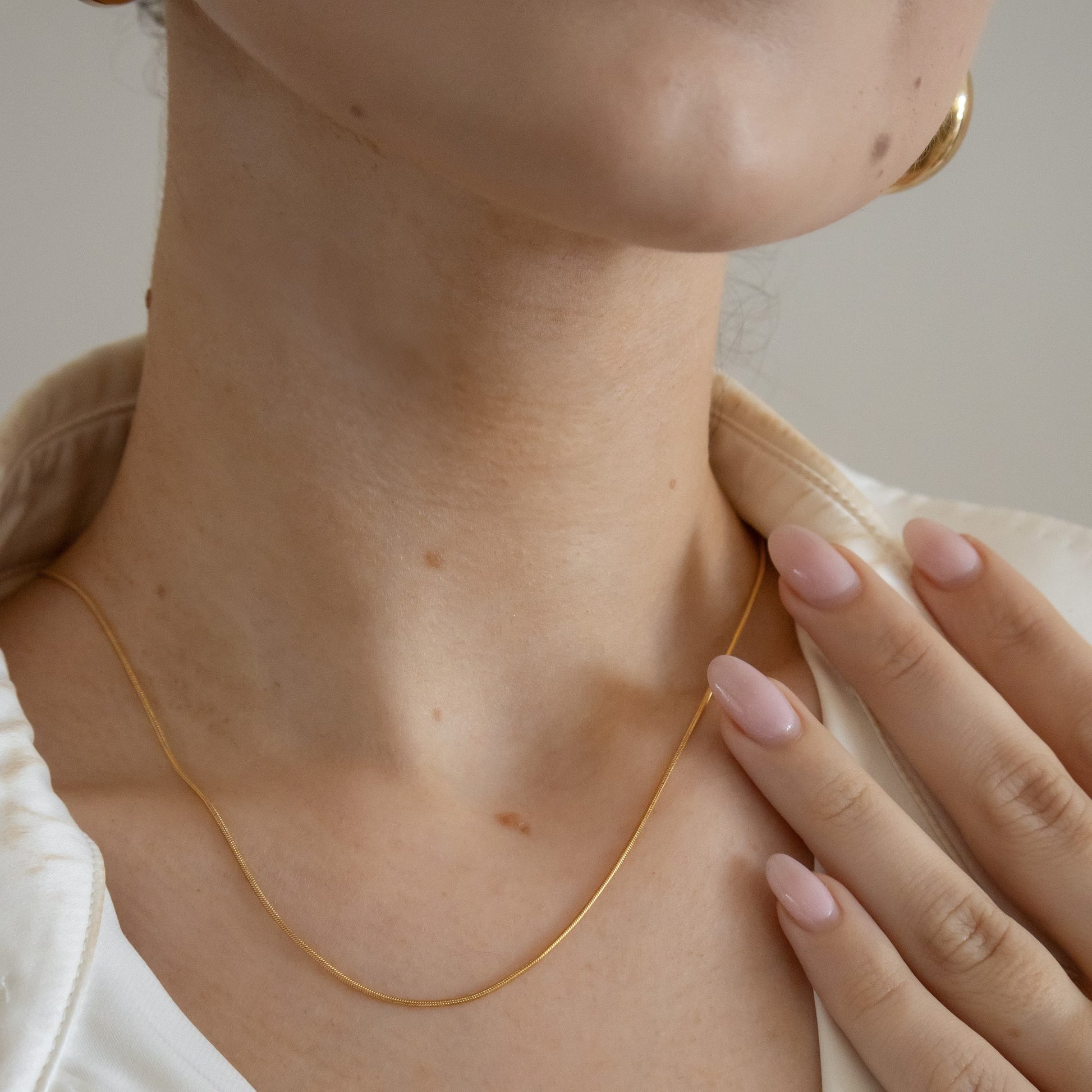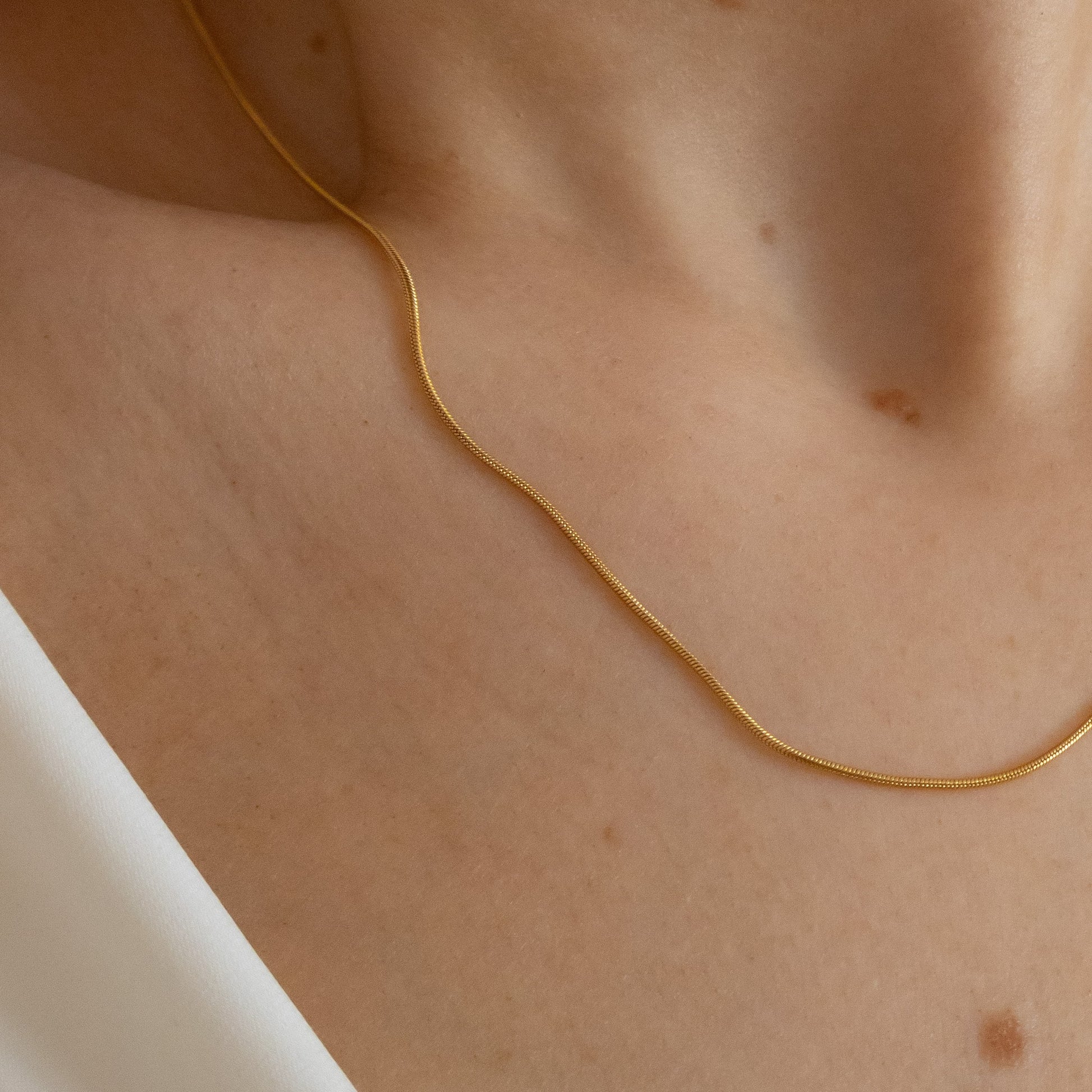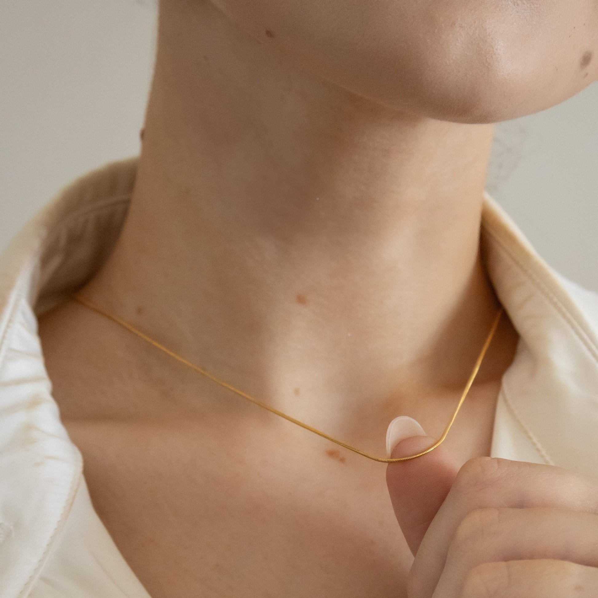 Elevate your style with the sleek sophistication of our 18k Gold Plated Skinny Snake Chain Necklace. Crafted for elegance and durability, this waterproof necklace is your perfect companion for every occasion. Its slender design offers a subtle touch of luxury, making it a versatile addition to any outfit.