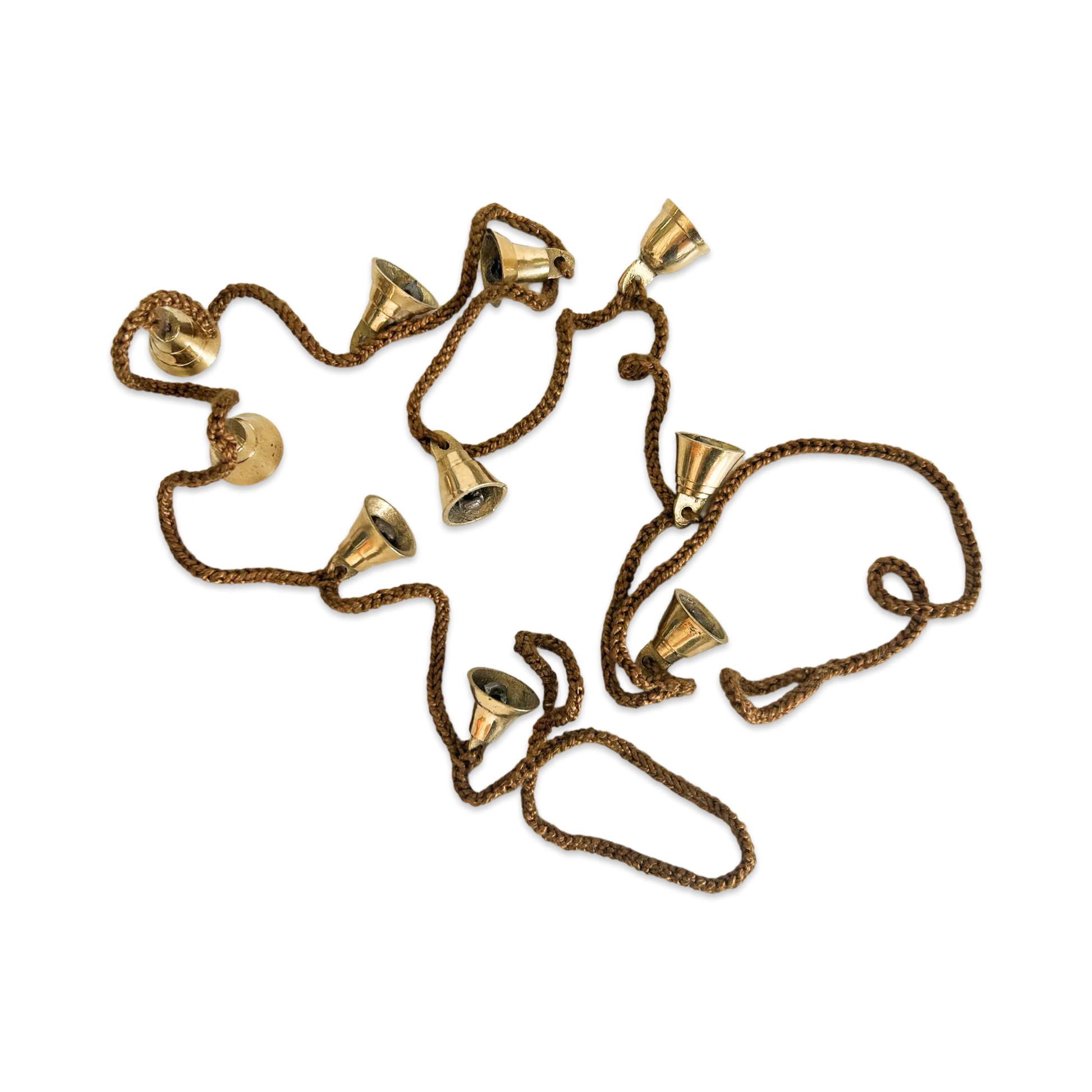 Indian brass hanging bells on a hand crocheted golden brown bamboo cord.