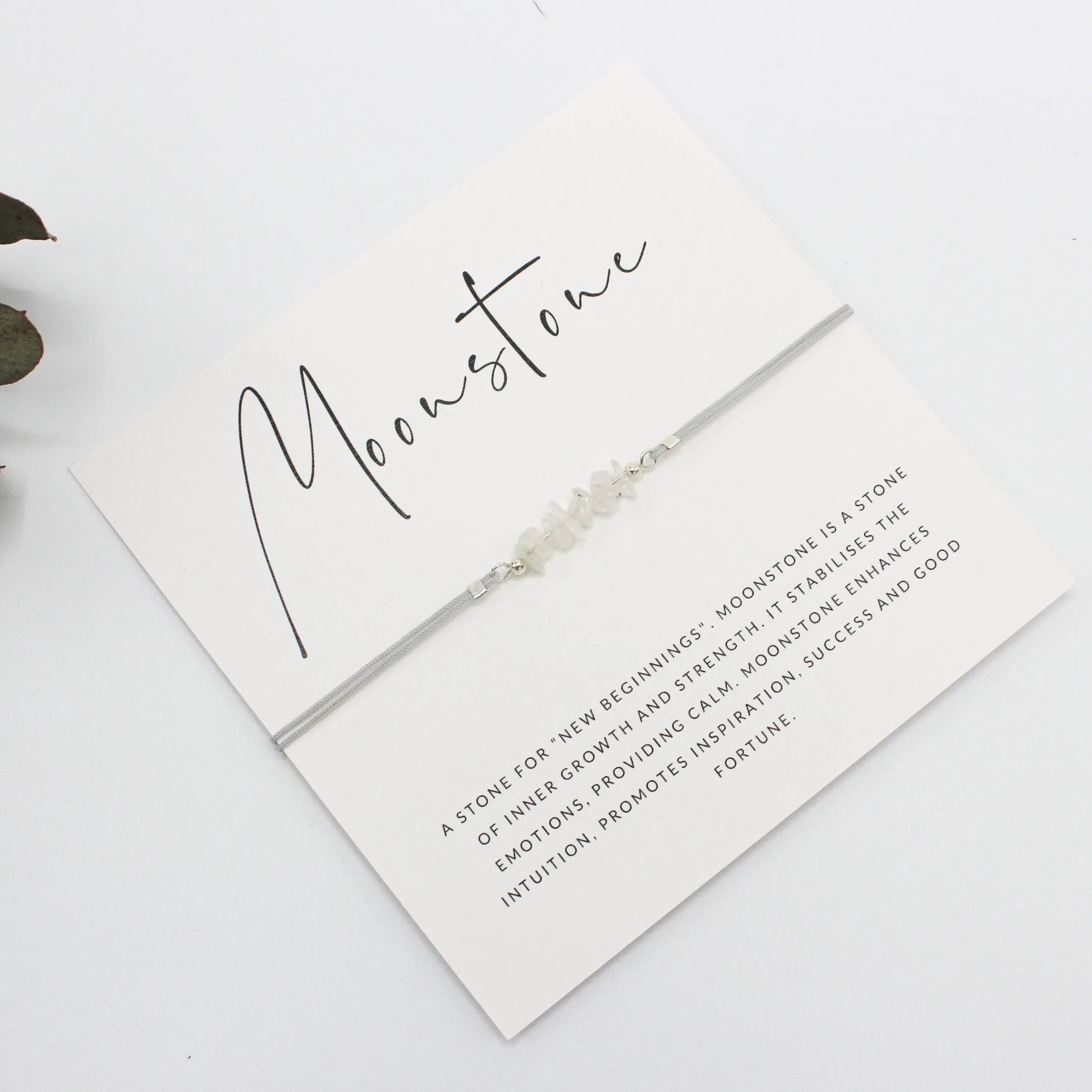" A stone for new beginnings, moonstone is the stone of inner growth and strength. It soothes emotional instability and stress and stabilises the emotions, providing calmness. Moonstone enhances intuition, promotes inspiration and good fortune in love and business."