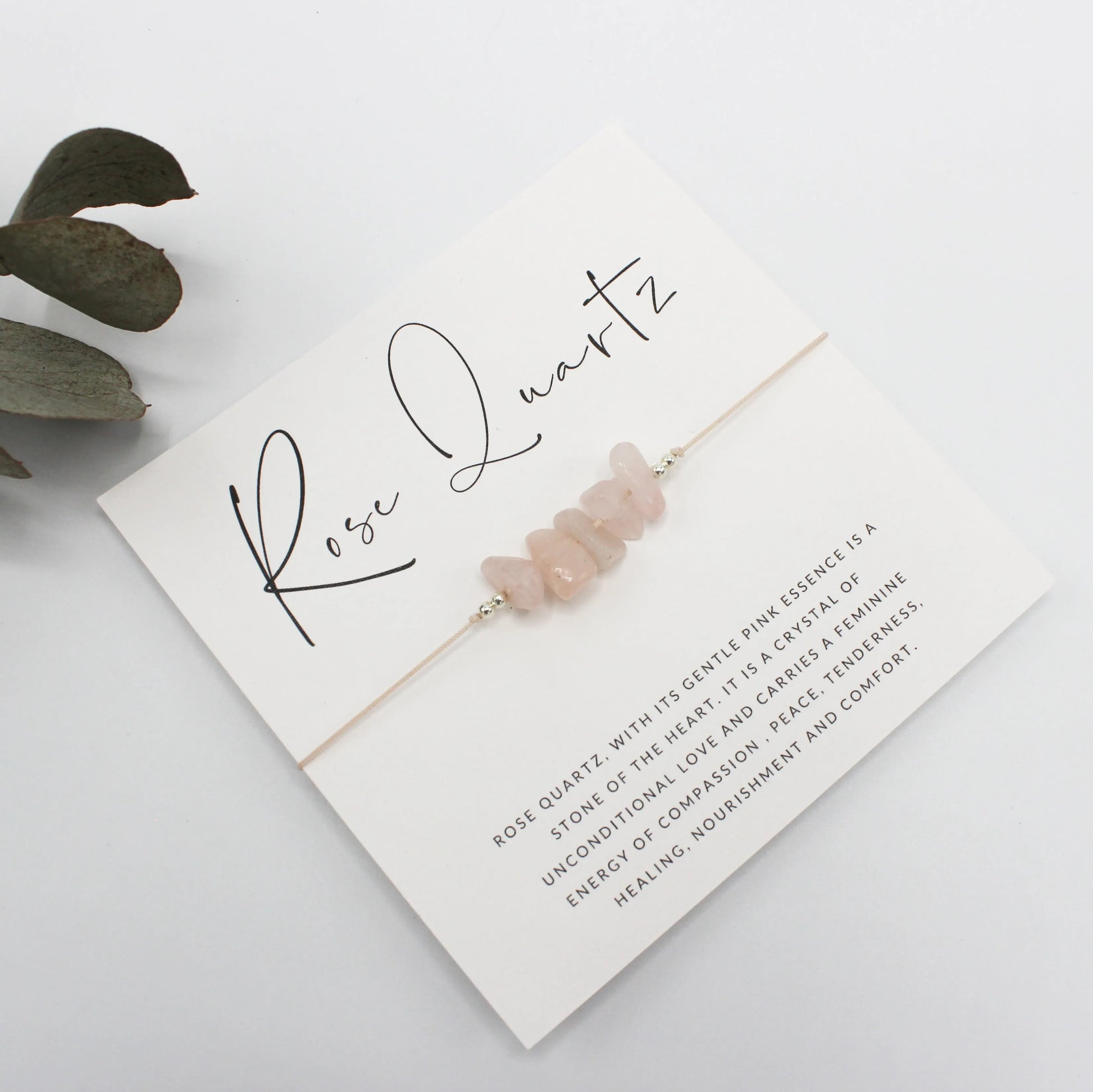 A beautiful rose quartz sits delicately on a silky cord. These bracelets are 100% adjustable, and are finished with intricate macrame knots.
